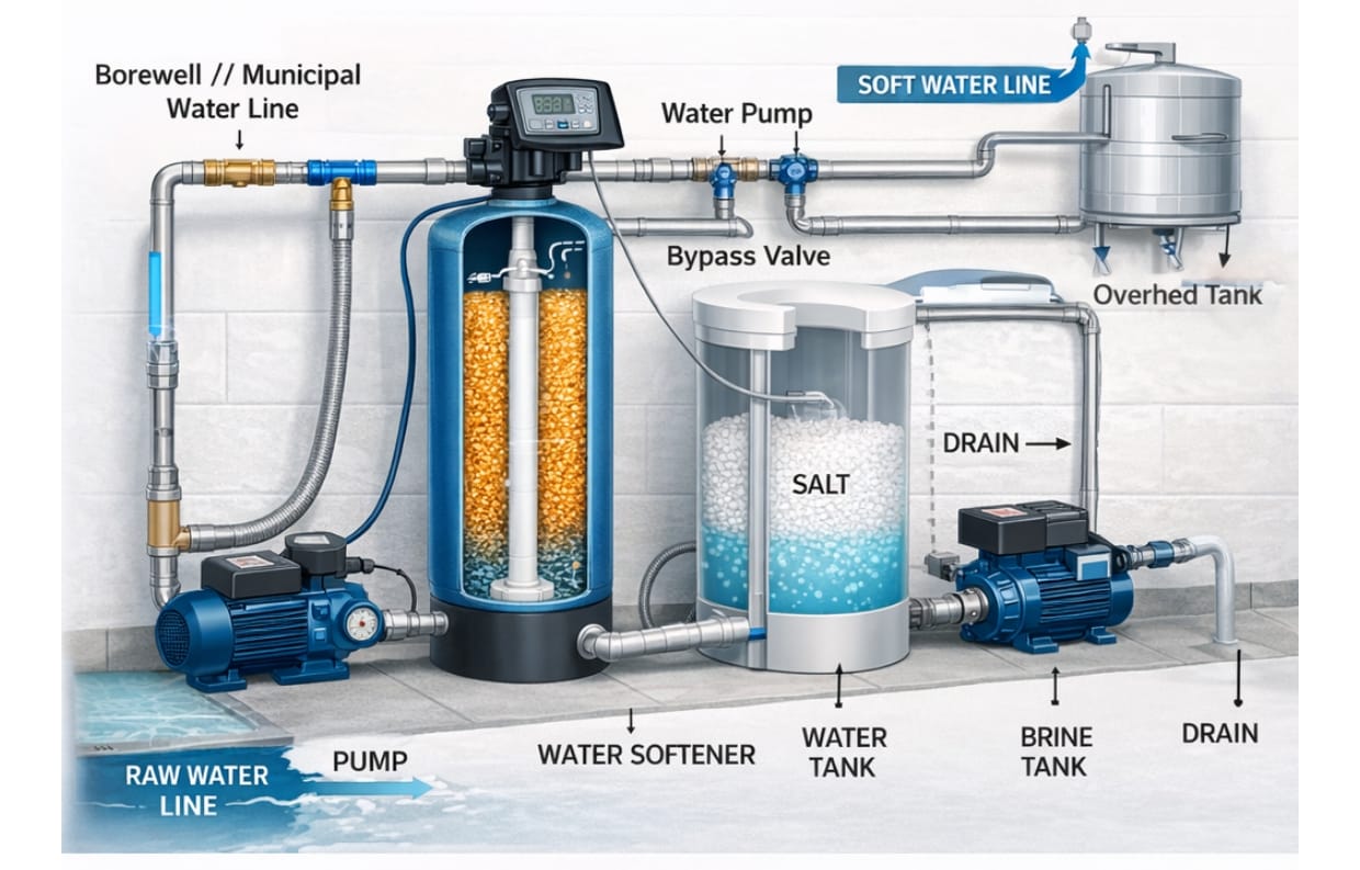 Water Softener removes hardness from water and protects your plumbing, bathroom fittings, RO, geyser and washing machine. It gives smooth water flow and improves skin, hair and appliance life.